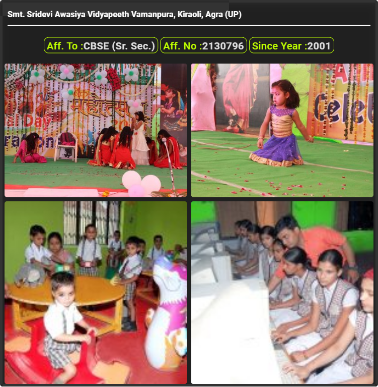 Smt. Sridevi Awasiya Vidyapeeth Vamanpura, Kiraoli, Agra (UP), was established in 2001. Smt. Sridevi Awasiya Vidyapeeth Vamanpura, Kiraoli, Agra (UP), is up to class Smt. Sridevi Awasiya Vidyapeeth Vamanpura, Kiraoli, Agra (UP). Smt. Sridevi Awasiya Vidyapeeth Vamanpura, Kiraoli, Agra (UP) is a CBSE (Sr. Sec.) Board school in Vamanpura, Agra District. Affilication no of this school is 2130796. Currently, Mr. Mayank Kishor Sharma is the Head/Principal of Smt. Sridevi Awasiya Vidyapeeth Vamanpura, Kiraoli, Agra (UP).This school has courses Pre Nursery, Nursery, Kindergarten (KG), Lower Kindergarten (LKG), Upper Kindergarten (UKG), Class 1st (I), Class 2nd(II), Class 3rd (III), Class 4th (IV), Class 5th (V), Class 6th (VI), Class 7th (VII), Class 8th (VIII), Class 9th (IX), Class 10th (X), Class 11th (XI), & Class 12th (XII). Check details of Smt. Sridevi Awasiya Vidyapeeth Vamanpura, Kiraoli, Agra (UP) Admission Form 2020, Contact Number (E-Mail/Phone Number), Fee Structure, and Latest Official Notice.
