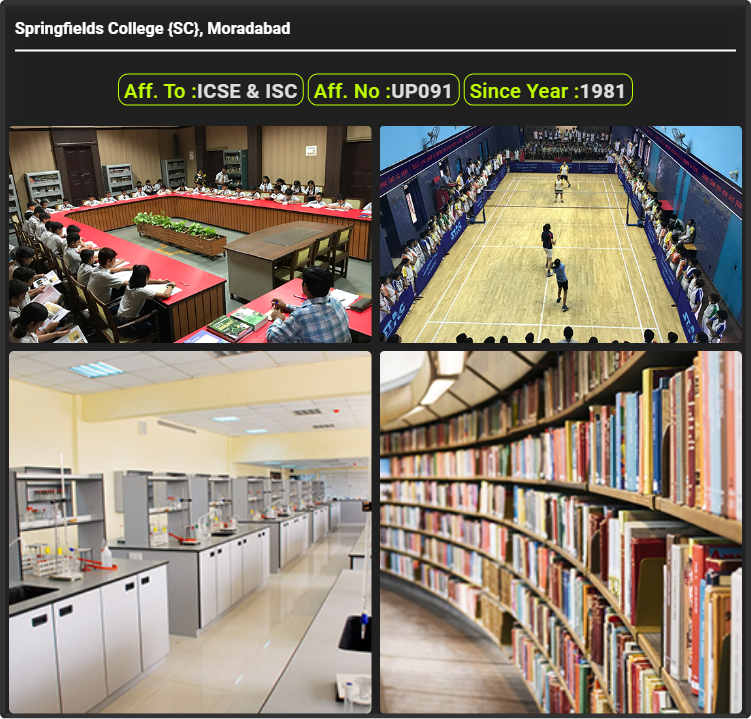 Springfields College {SC}, Moradabad, was established in 1981. Springfields College {SC}, Moradabad, is up to class Springfields College {SC}, Moradabad. Springfields College {SC}, Moradabad is a ICSE & ISC Board school in Delhi Road, Moradabad District. Affiliation no of this school is UP091. Currently, Dr.(Mrs.) SWATI SHARMA is the Head/Principal of Springfields College {SC}, Moradabad.This school has courses Class NUR. & LKG, Class I, Class II, Class III, Class IV, Class V, Class VI, Class VII, Class VIII, Class IX, Class X, Class XI, Class XII, . Check details of Springfields College {SC}, Moradabad Admission Form 2022-23, Contact Number (E-Mail/Phone Number), Fee Structure, and Latest Official Notice.