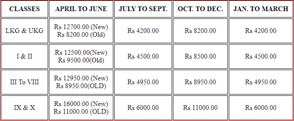 Get fee details about admission, Tuition fee and transort fee and other fee details.