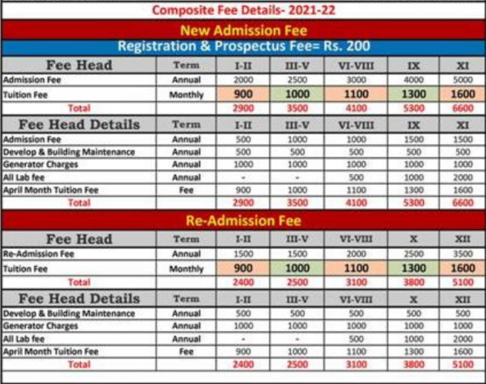 Note: Please contact school or visit official site for updated fee structure for year 2023- 2024.