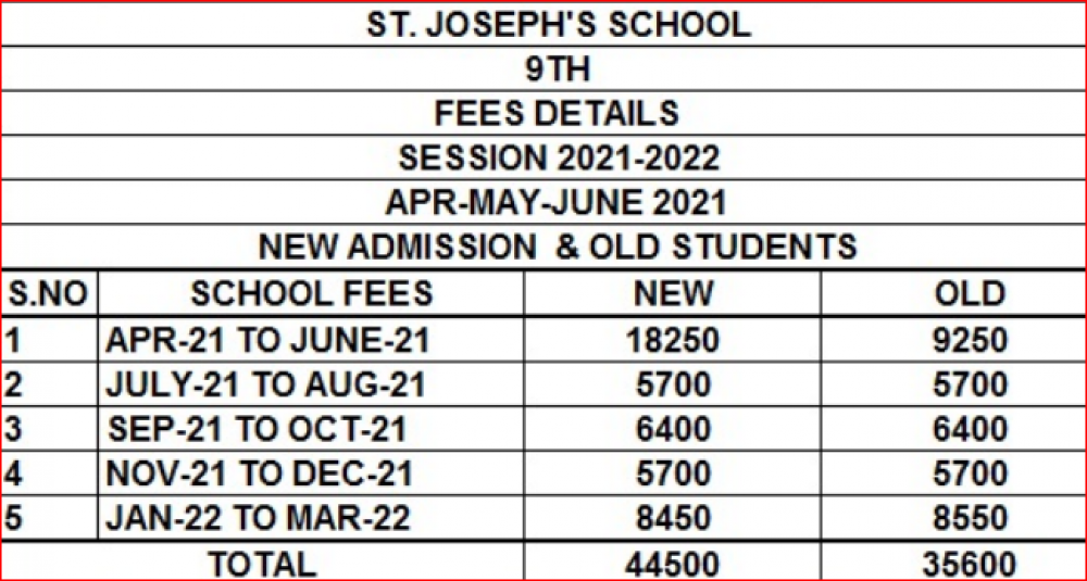 {St. Joseph's School Civil Lines, Pratapgarh Fee tructure -(Based on Previous Year)}