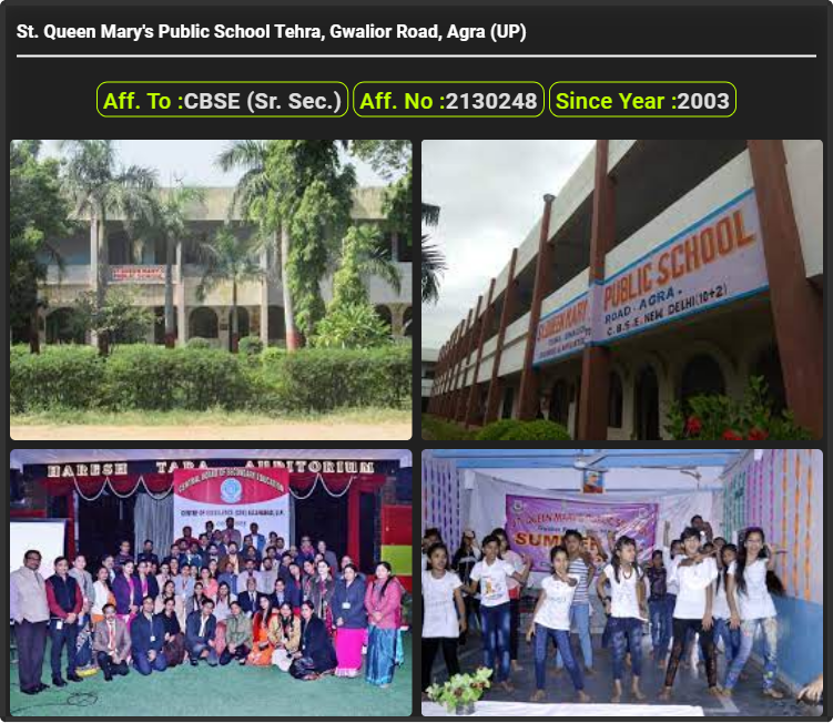 St. Queen Mary's Public School Tehra, Gwalior Road, Agra (UP), was established in 2003. St. Queen Mary's Public School Tehra, Gwalior Road, Agra (UP), is up to class St. Queen Mary's Public School Tehra, Gwalior Road, Agra (UP). St. Queen Mary's Public School Tehra, Gwalior Road, Agra (UP) is a CBSE (Sr. Sec.) Board school in Tehra, Gwalior Rd, Agra District. Affilication no of this school is 2130248. Currently, Geeta Dutt is the Head/Principal of St. Queen Mary's Public School Tehra, Gwalior Road, Agra (UP).This school has courses Nursery, Kindergarten (KG), Class 1st (I), Class 2nd(II), Class 3rd (III), Class 4th (IV), Class 5th (V), Class 6th (VI), Class 7th (VII), Class 8th (VIII), Class 9th (IX), Class 10th (X), Class 11th (XI), & Class 12th (XII). Check details of St. Queen Mary's Public School Tehra, Gwalior Road, Agra (UP) Admission Form 2020, Contact Number (E-Mail/Phone Number), Fee Structure, and Latest Official Notice.