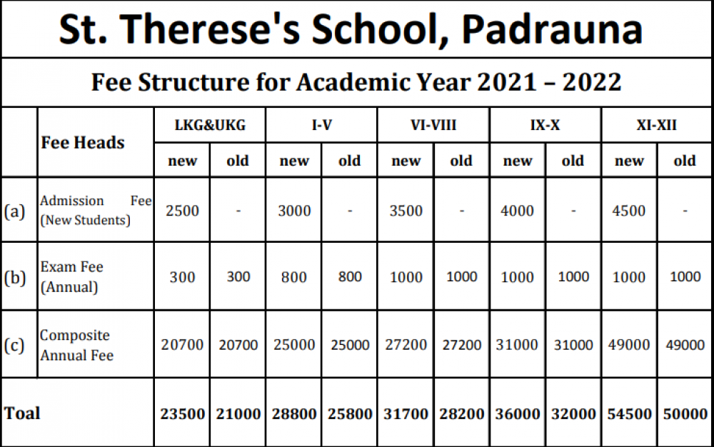 {St. Therese's School, Padrauna Kushinagar Fee Structure -(Based on Previous Year)}