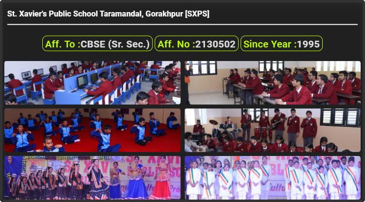 St. Xavier's Public School Taramandal, Gorakhpur [SXPS], was established in 1995. St. Xavier's Public School Taramandal, Gorakhpur [SXPS], is up to class St. Xavier's Public School Taramandal, Gorakhpur [SXPS]. St. Xavier's Public School Taramandal, Gorakhpur [SXPS] is a CBSE (Sr. Sec.) Board school in Taramandal, Gorakhpur District. Affiliation no of this school is 2130502. Currently, Pankaj Rai is the Head/Principal of St. Xavier's Public School Taramandal, Gorakhpur [SXPS].This school has courses Class Playway, Class 1st (I), Class 2nd(II), Class 3rd (III), Class 4th (IV), Class 5th (V), Class 6th (VI), Class 7th (VII), Class 8th (VIII), Class 9th (IX), Class 10th (X), Class 11th (XI) & Class 12th (XII). Check details of St. Xavier's Public School Taramandal, Gorakhpur [SXPS] Admission Form -(Based on Previous Year), Contact Number (E-Mail/Phone Number), Fee Structure, and Latest Official Notice.