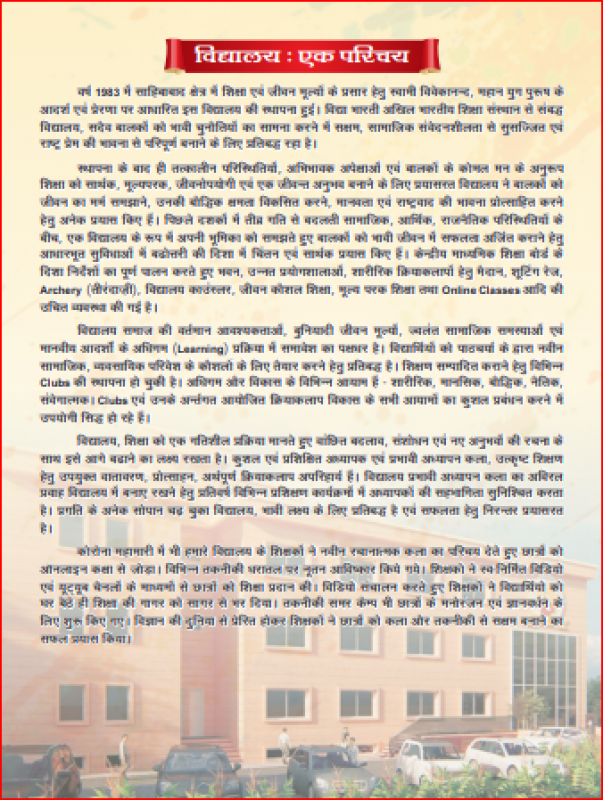 CLASS VI TO IX:-1. Transfer certificate from the school where the students were studying. 2. Prospectus and Application form can be obtained from the office of the school during the fixed hours for those classes in which vacancies are declared. 3. Stamp-size photographs of the student to be affixed on the Application form and interview slip. 4. The parents of the student shall necessarily be presented to submit the Application form in the school. 5. Date of Birth shall not be changed at any stage later. Written Test and Interviews 1. Written Tests will be taken in English, Mathematics, General Science/Physics, Chemistry, Biology, Computer, and Hindi. 2. List of the students selected will be displayed on the school notice board. 3. The following documents are required at the time of the interview:- A. The Interview slip. B. The original Report Card (mark list) of the qualifying examination. C. A birth certificate from the School, where the Candidate is studying.