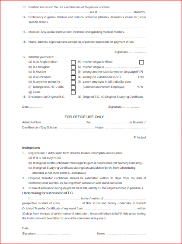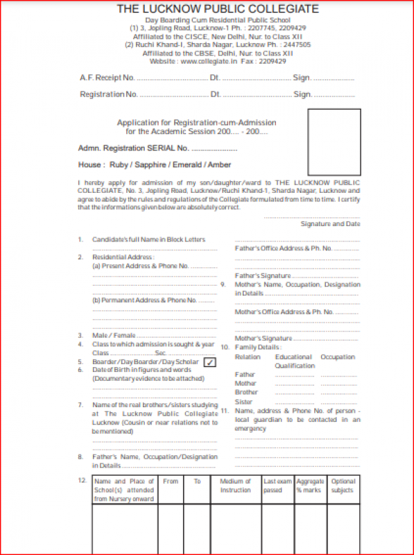 {The Lucknow Public Collegiate, Sharda Nagar Admission form -(Based on Previous Year)}
