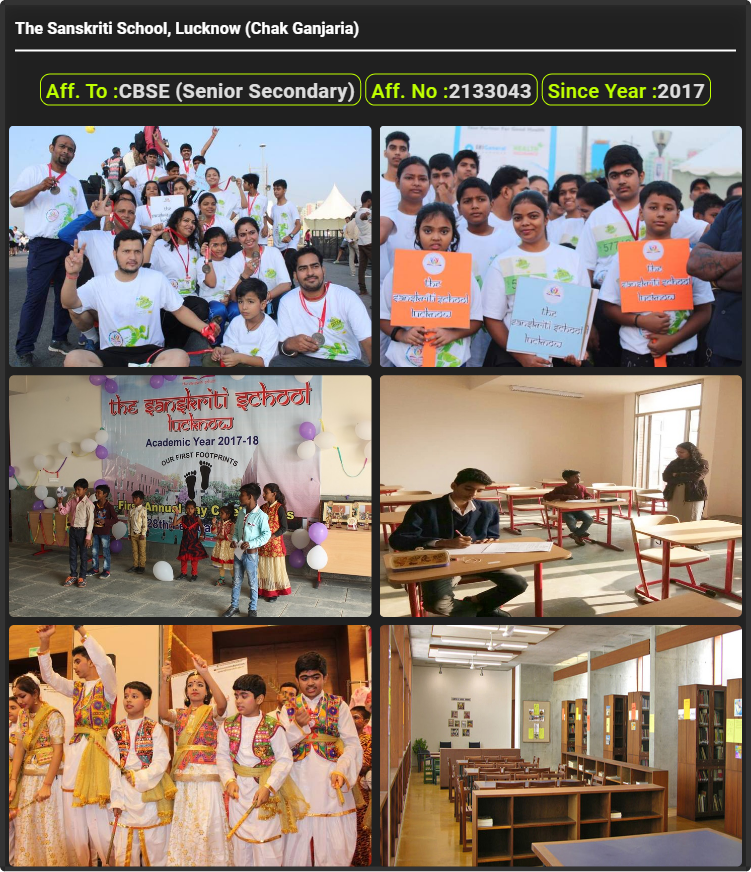 The Sanskriti School, Lucknow (Chak Ganjaria), was established in 2017. The Sanskriti School, Lucknow (Chak Ganjaria), is up to class The Sanskriti School, Lucknow (Chak Ganjaria). The Sanskriti School, Lucknow (Chak Ganjaria) is a CBSE (Senior Secondary) Board school in CG City, Chak Ganjaria, Lucknow District. Affiliation no of this school is 2133043. Currently, Dr. Padma Hariharan is the Head/Principal of The Sanskriti School, Lucknow (Chak Ganjaria).This school has courses Class Nursery, Class I, Class II, Class III, Class IV, Class V, Class VI, Class VII, Class VIII, Class IX, Class X, Class XI & Class XII. Check details of The Sanskriti School, Lucknow (Chak Ganjaria) Admission Form 2022-23, Contact Number (E-Mail/Phone Number), Fee Structure, and Latest Official Notice.