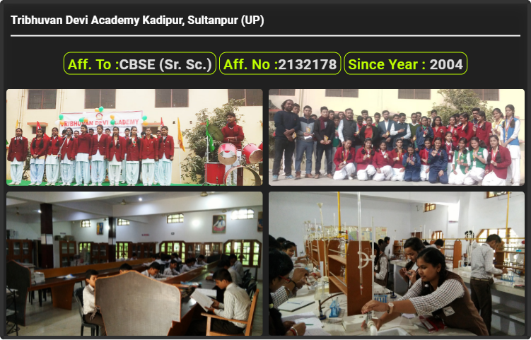 Tribhuvan Devi Academy Kadipur, Sultanpur (UP), was established in 2004. Tribhuvan Devi Academy Kadipur, Sultanpur (UP), is up to class Tribhuvan Devi Academy Kadipur, Sultanpur (UP). Tribhuvan Devi Academy Kadipur, Sultanpur (UP) is a CBSE (Sr. Sc.) Board school in Kadipur, Sultanpur District. Affilication no of this school is 2132178. Currently, Mr. Arun Kumar Singh is the Head/Principal of Tribhuvan Devi Academy Kadipur, Sultanpur (UP).This school has courses Class 1st (I), Class 2nd(II), Class 3rd (III), Class 4th (IV), Class 5th (V), Class 6th (VI), Class 7th (VII), Class 8th (VIII), Class 9th (IX), Class 10th (X), Class 11th (XI) & Class 12th (XII). Check details of Tribhuvan Devi Academy Kadipur, Sultanpur (UP) Admission Form 2020, Contact Number (E-Mail/Phone Number), Fee Structure, and Latest Official Notice.