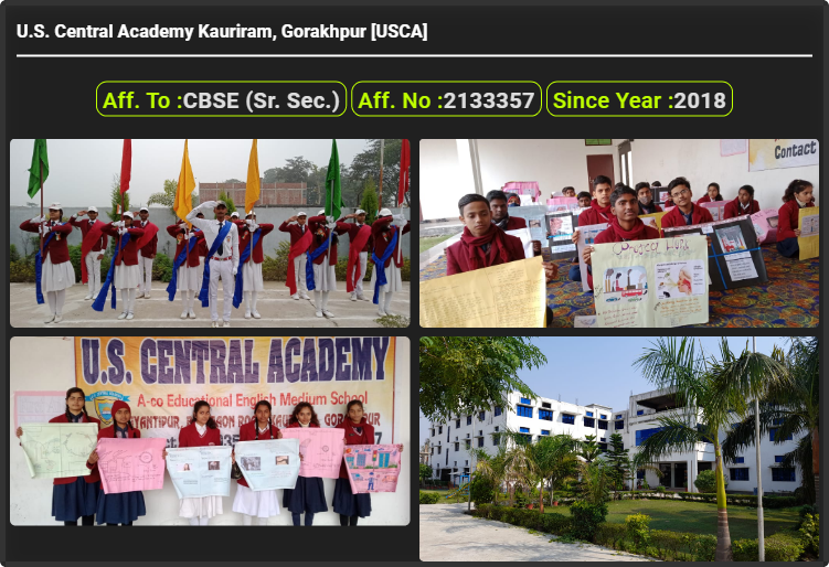U.S. Central Academy Kauriram, Gorakhpur [USCA], was established in 2018 U.S. Central Academy Kauriram, Gorakhpur [USCA], is up to class U.S. Central Academy Kauriram, Gorakhpur [USCA]. U.S. Central Academy Kauriram, Gorakhpur [USCA] is a CBSE (Sr. Sec.) Board school in Kauriram, Gorakhpur District. Affiliation no of this school is 2133357. Currently, Soma Das is the Head/Principal of U.S. Central Academy Kauriram, Gorakhpur [USCA].This school has courses Class Nursery, Class 1st (I), Class 2nd(II), Class 3rd (III), Class 4th (IV), Class 5th (V), Class 6th (VI), Class 7th (VII), Class 8th (VIII), Class 9th (IX), Class 10th (X), Class 11th (XI) & Class 12th (XII). Check details of U.S. Central Academy Kauriram, Gorakhpur [USCA] Admission Form -(Based on Previous Year), Contact Number (E-Mail/Phone Number), Fee Structure, and Latest Official Notice.