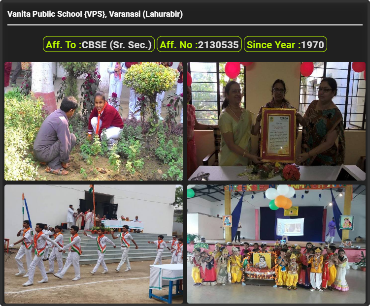 Vanita Public School {VPS}, Varanasi (Lahurabir), was established in 1970. Vanita Public School {VPS}, Varanasi (Lahurabir), is up to class Vanita Public School {VPS}, Varanasi (Lahurabir). Vanita Public School {VPS}, Varanasi (Lahurabir) is a CBSE (Sr. Sec.) Board school in Lahurabir, Varanasi District. Affiliation no of this school is 2130535.This school has courses Class Nursery, Class LKG, Class UKG, Class 1st (I), Class 2nd(II), Class 3rd (III), Class 4th (IV), Class 5th (V), Class 6th (VI), Class 7th (VII), Class 8th (VIII), Class 9th (IX), Class 10th (X), Class 11th (XI) & Class 12th (XII). Check details of Vanita Public School {VPS}, Varanasi (Lahurabir) Admission Form 2022-23, Contact Number (E-Mail/Phone Number), Fee Structure, and Latest Official Notice.