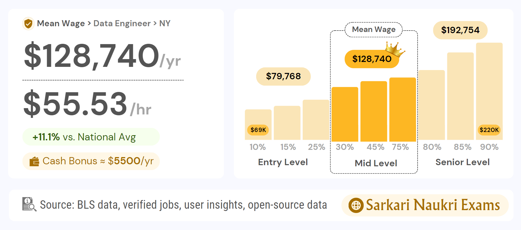 The average salary for a Data Engineer in New York, NY is $128,740 per year and $55.53 per hour. In New York City, Data Engineers have seen a 11.1% increase in the national average salary. Apart from the base salary, NY Data Engineer can earns cash bonus appro $5500 yearly and stocks share. In 2024, Entry Level Data Engineer Salary New York is $79,768 per year with 0-3 year of experience.