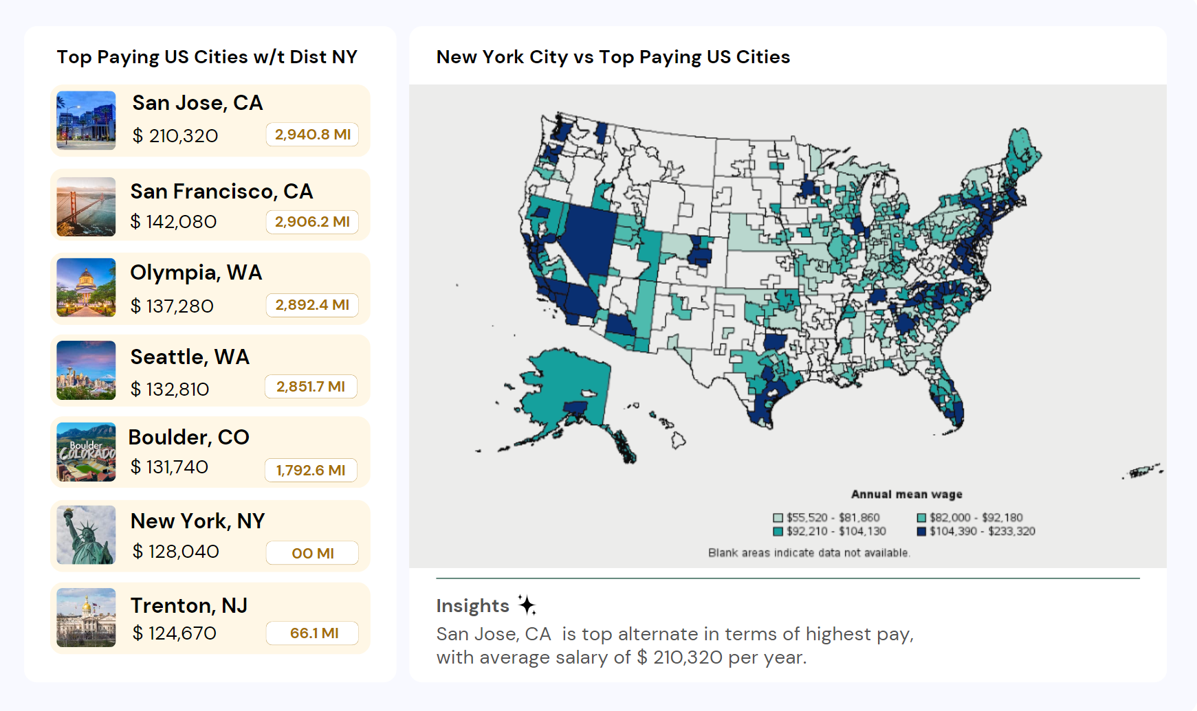 The New York Data Engineer Salary is much lower than other places. In San Jose, CA Data Engineer get highest salary in US with $210,320 per year, and this is 2940 mile away from New York.