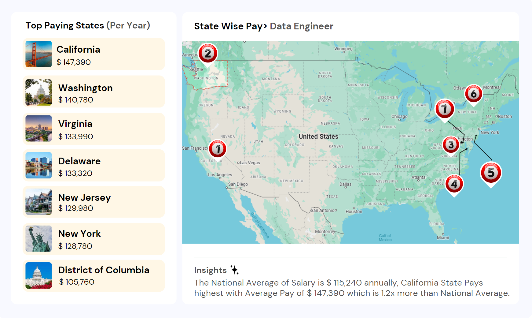 The average salary for a Data Engineer of New York state is highest in US. Other top paying states are California, Washington, Virginia, Delware, New Jersery, and District of Columbia.