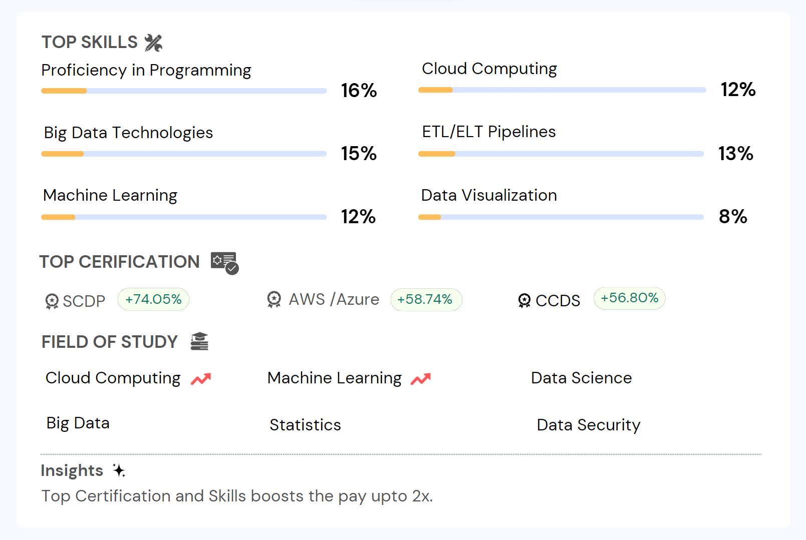 To increase the salary as Data Engineer in New York, you need to adopt proper skills, certifications and must have perfect in filed of study. This will make salary hike of upto 2x within few years.