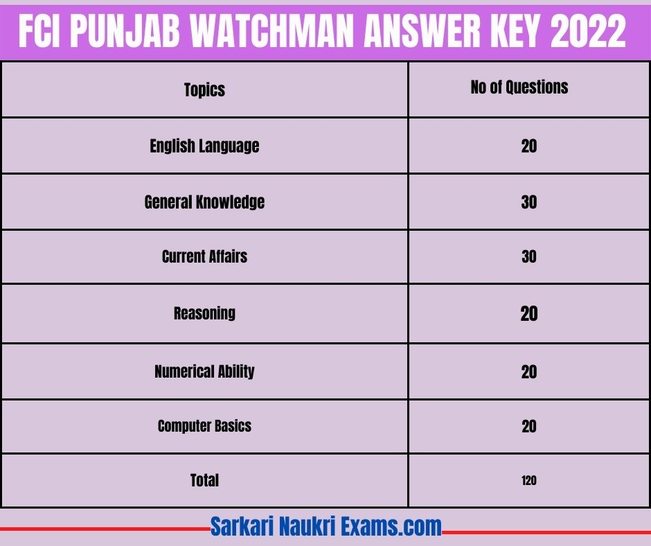 FCI Punjab Watchman Answer Key The exam for FCI Punjab Watchman Exam will be held on 9 Oct 2022 in various shifts under the new educational exam policy. The total duration of the FCI Punjab Watchman Exam is 90 minutes. And there is a total of 120 questions which total of which 30 questions will be asked from General Knowledge and which will be a total of 30 marks. and a total of 20 questions asked from General English it will be 20 marks. and a total of 30 questions asked from Current Affairs it will be 30 marks. and a total of 20 questions asked from Reasoning it will be 20 marks. and a total of 20 questions asked from Numerical Ability it will be 20 marks total of 20 questions asked from General English it will be 20 marks Download FCI Punjab Watchman Answer Key from the link given below. This year lakhs of students have applied to become Watchman through FCI Punjab Watchman Exam. Follow the steps given below to check and download the Watchman Answer Key 2022 from the link given below.
