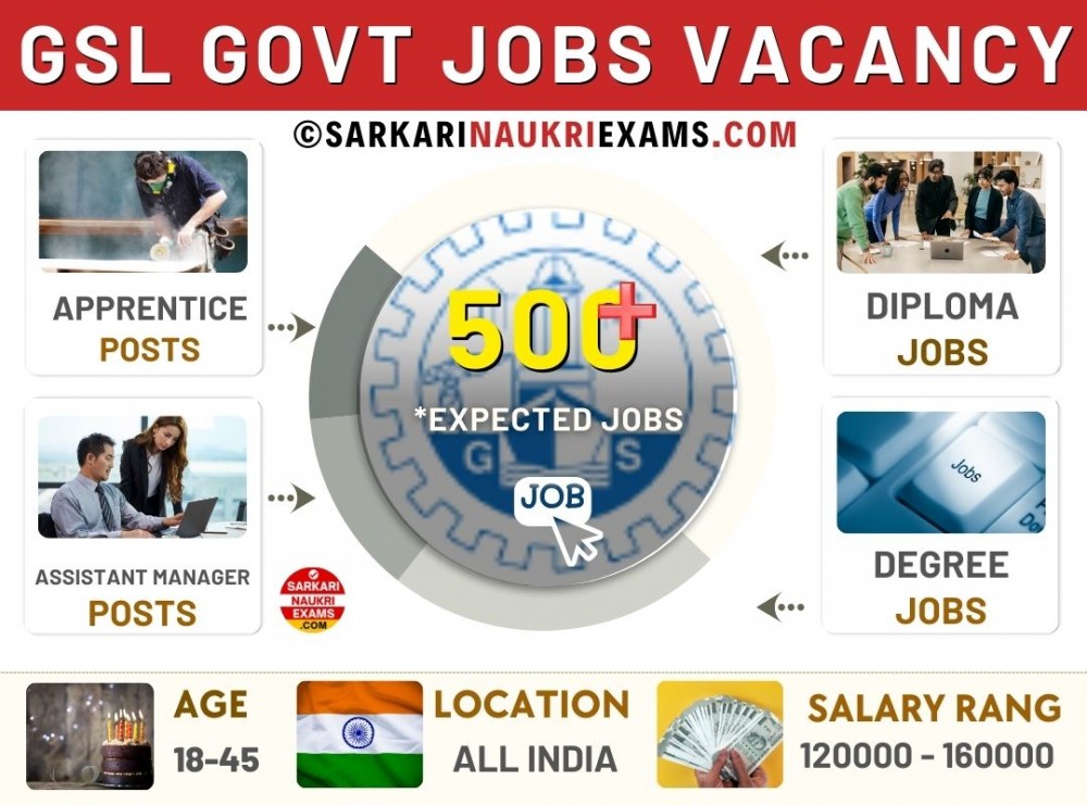 The age group for GSL vacancies is 18 to 45 years. The salary is ₹1,20,000 to ₹1,60,000 per month, which translates to ₹14.4–19.2 lakh per year. The selection is either through exams or direct recruitment. The application fee varies between ₹0 and ₹500.