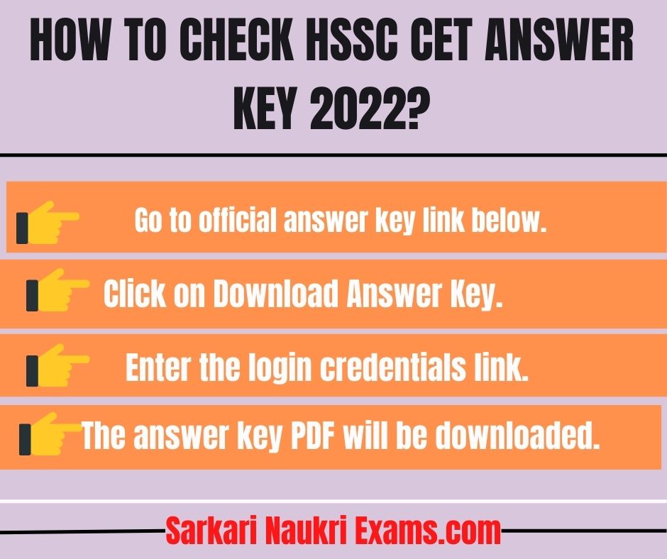 HSSC CET Answer Key 2022, HSSC CET Exam Answer Key 2022 SET A, B, C, D: HSSC CET Exam Answer Key for General Studies. HSSC CET Answer Key 2022 exam is held on 5, 6 November 2022. Haryana Common Eligibility Test CET Answer Key 2022 PDF download from the official website i.e https://www.hssc.gov.in// Millions of students applied for this job. HSSC CET Answer Key 2022 Sarkari Result Direct Link to check and download online. Follow the steps to check and download the Haryana Common Eligibility Test CET Answer Key 2022 below.