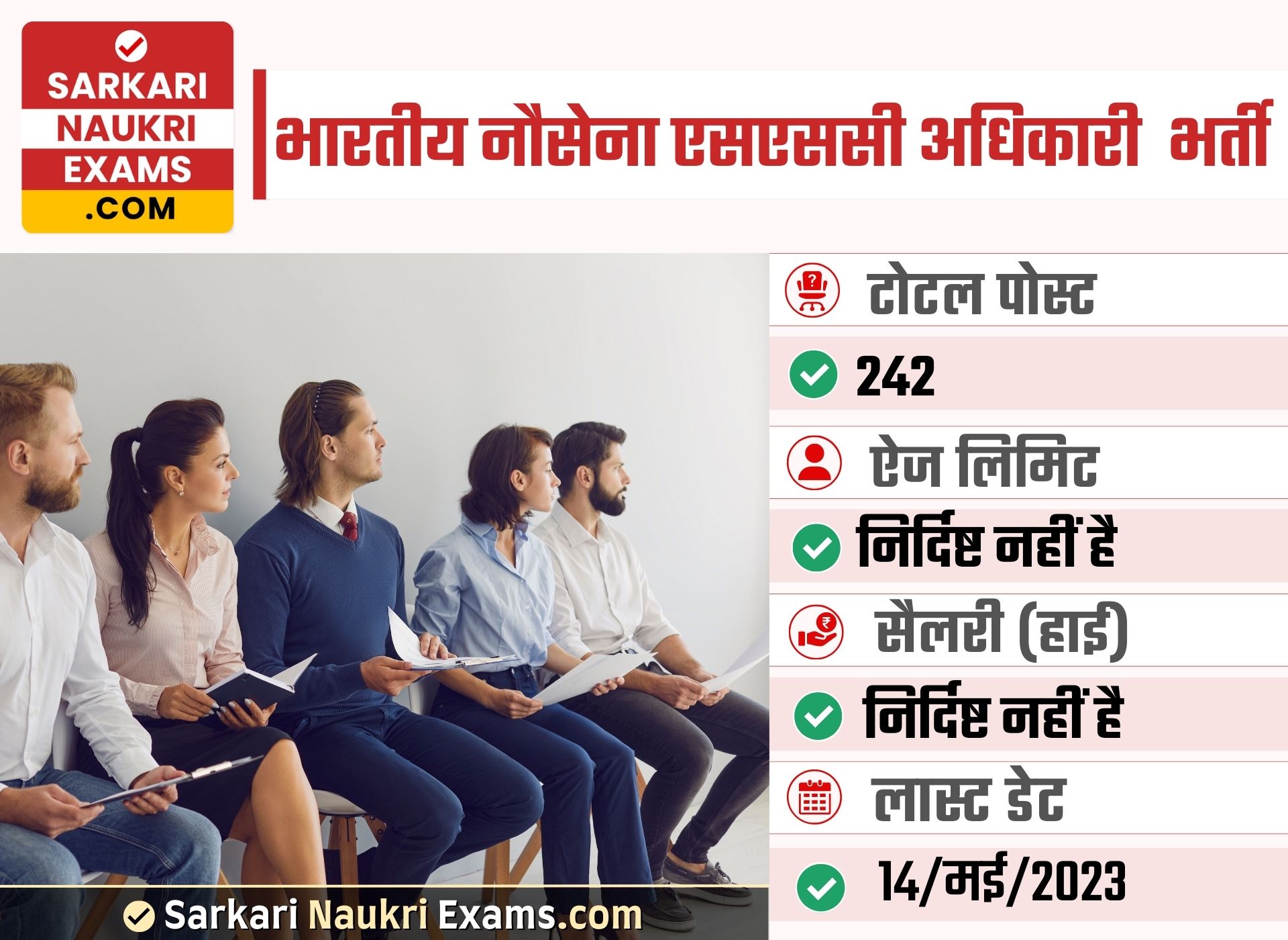 There are total 242 vacancies for this post notification. Pay Scale for this vacancy is Rs.(As per department rule). Selection for this job will be based on Interview. The Last Date for Application Closing is 14/May/2023. You can download notification from Here. If you want other details such as admit card, answer key & result for 2024 year, visit official website https://www.joinindiannavy.gov.in/. For Latest Sarkari Result, Sarkari Exam & sarkariresult Updates keep visiting www.sarkarinaukriexams.com.