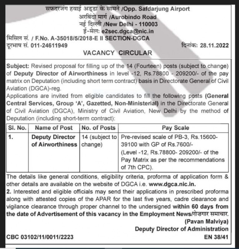 Vacancy Details MCA Deputy Director Of Airworthiness Recruitment 2023