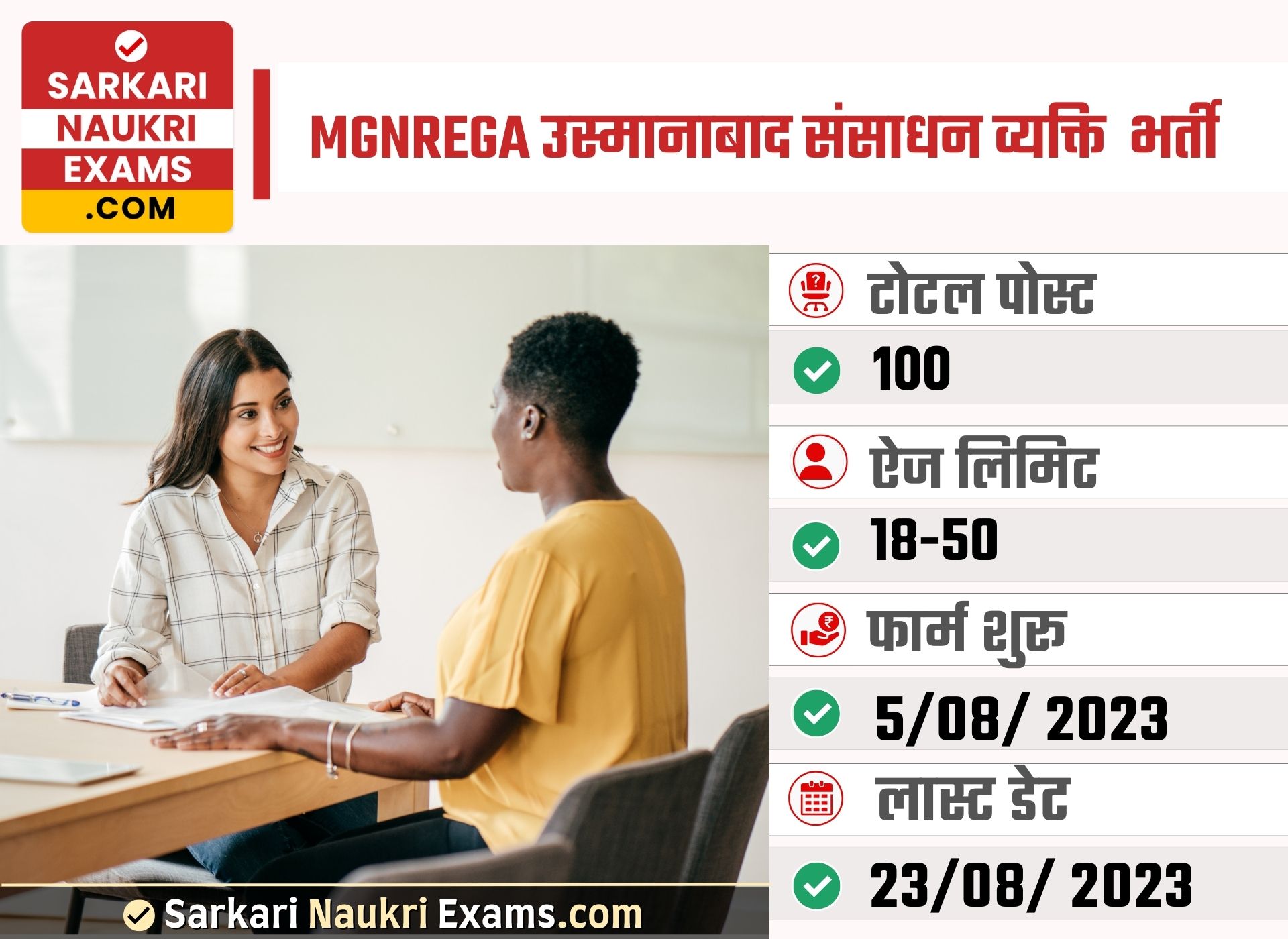 ⭐What is the total number of vacancies available for the Resource Person position in MGNREGA Osmanabad Recruitment 2023?There are a total of 100 vacancies available for the Resource Person position in the MGNREGA Osmanabad Recruitment 2023.