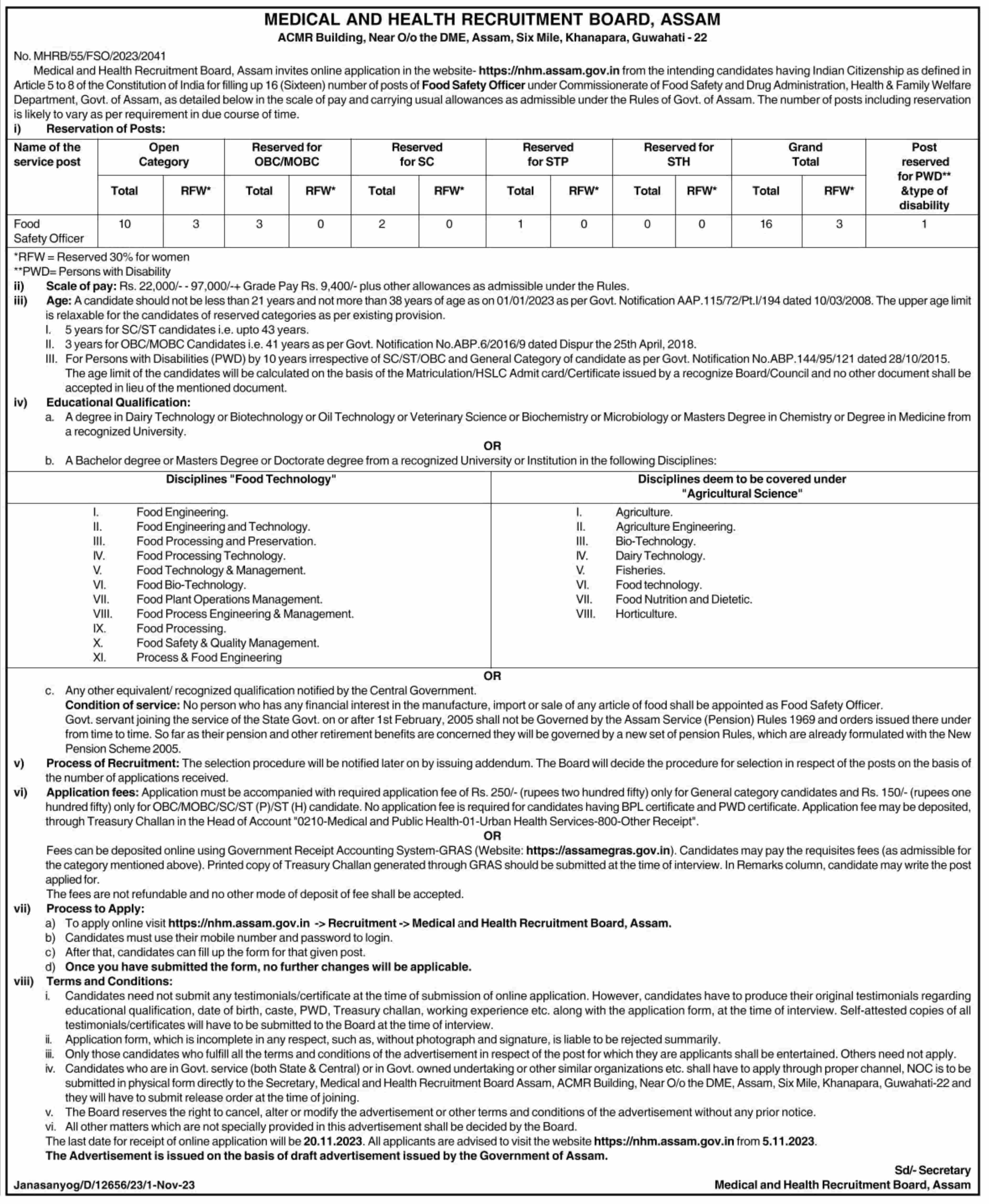 There are total 16 vacancies for this post notification. Min Pay Scale Monthly for this post is Rs.(22,000/-). Pay Scale for this vacancy is Rs.(22,000/--97,000/-). Max Pay Scale Monthly Rs.(97,000/-). Selection for this job will be based on Written Exam. The Last Date for Application Closing is 20/Nov/2023. Fee for General Candidate is Rs.250, OBC - Rs.150 , SC - Rs.150 & ST - Rs.150. You can download notification from Here. If you want other details such as admit card, answer key & result for 2024 year, visit official website https://nhm.assam.gov.in/. For Latest Sarkari Result, Sarkari Exam & sarkariresult Updates keep visiting www.sarkarinaukriexams.com.