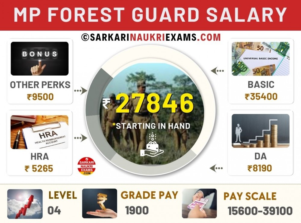 MP Forest Guard basic pay ranges from ₹19,500 to ₹62,000 per month. He has a pay grade of ₹1,900 under Level 04. It is a Pay Band 3 job and the pay scale ranges between ₹5,200 and ₹20,200.