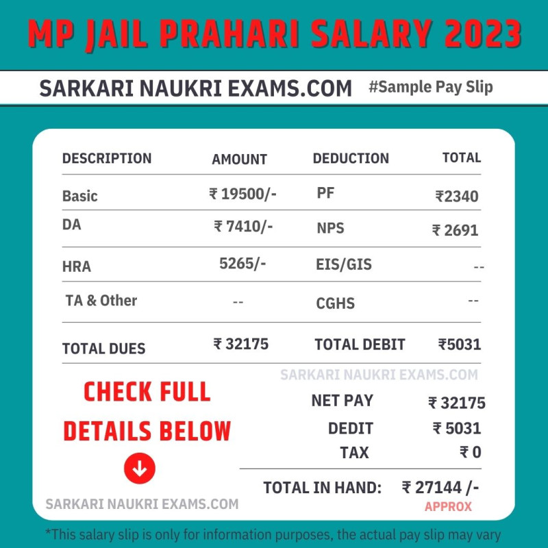 Deduction amount of NPS, PF & Income tax will be done in MP Jail Prahari basic salary & DA as per Madhya Pradesh Jail Prahari norms.