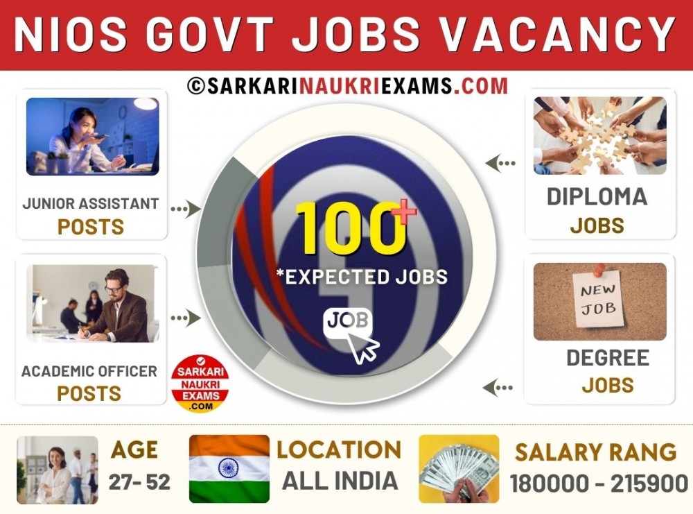 The National Institute of Open Schooling (NIOS) will release more than 100 government job vacancies for positions such as Junior Assistant (Accounts), Academic Officer, Stenographer, and others. Candidates aged 27 to 52 years can apply online or offline. More than 100 positions across India are available, with an application fee ranging from ₹0 to ₹750.