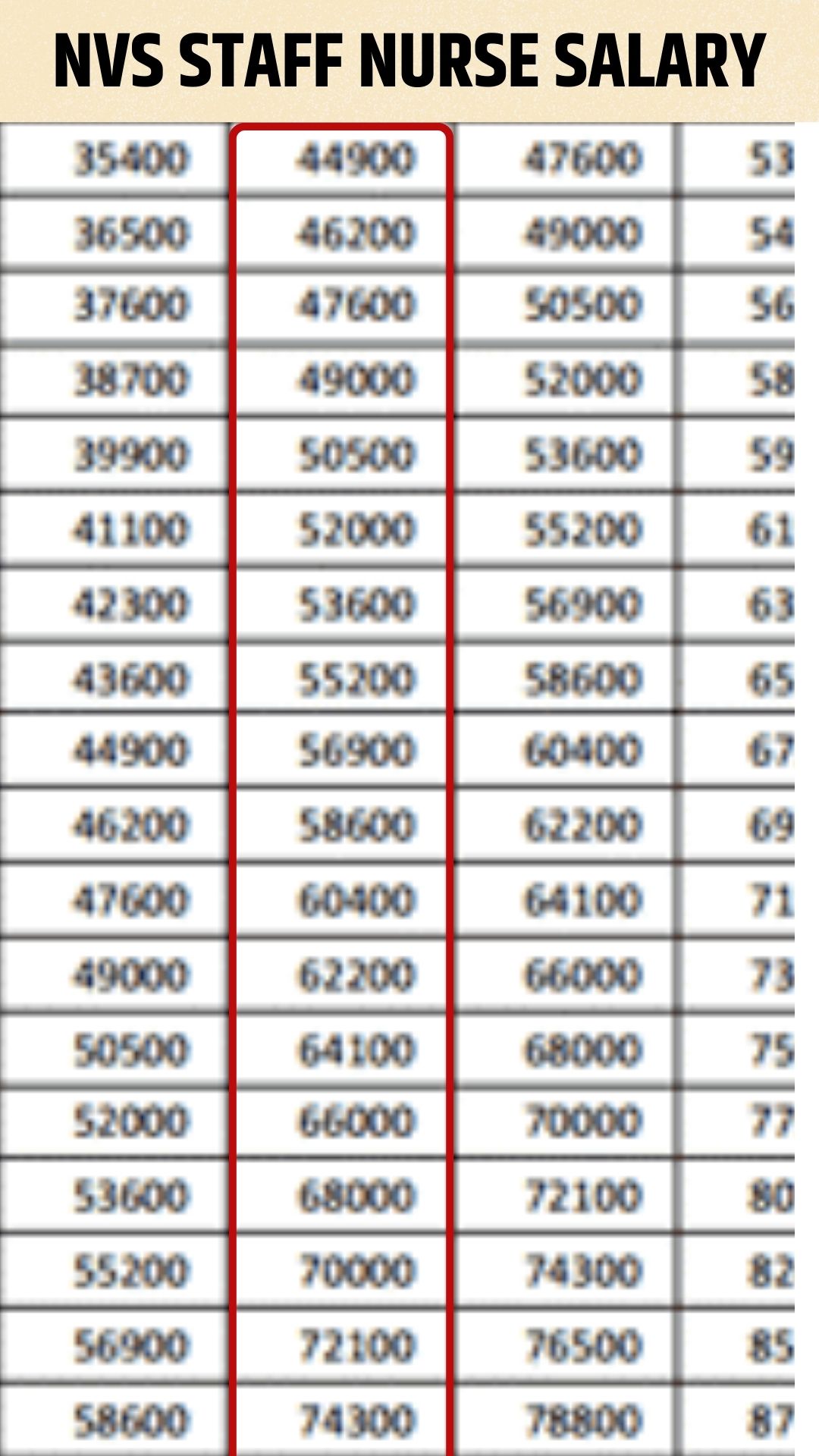 ┬аNVS Staff Nurse Salary 2026: NVS Staff Nurse, the expected base salary ranges between Rs. 44900 and a salary cap of Rs. 142400, with a monthly base salary of Grade Pay 4600. Along with their salary, they are entitled to various additional benefits. With the implementation of the seventh pay commission and potential allowance increases, the starting salary for an NVS Staff Nurse may increase up to approximately Rs. 64,297/- Moreover, the maximum payout upon retirement is higher than what was initially estimated. The NVS Staff Nurse pay scale and grade pay details are also provided.