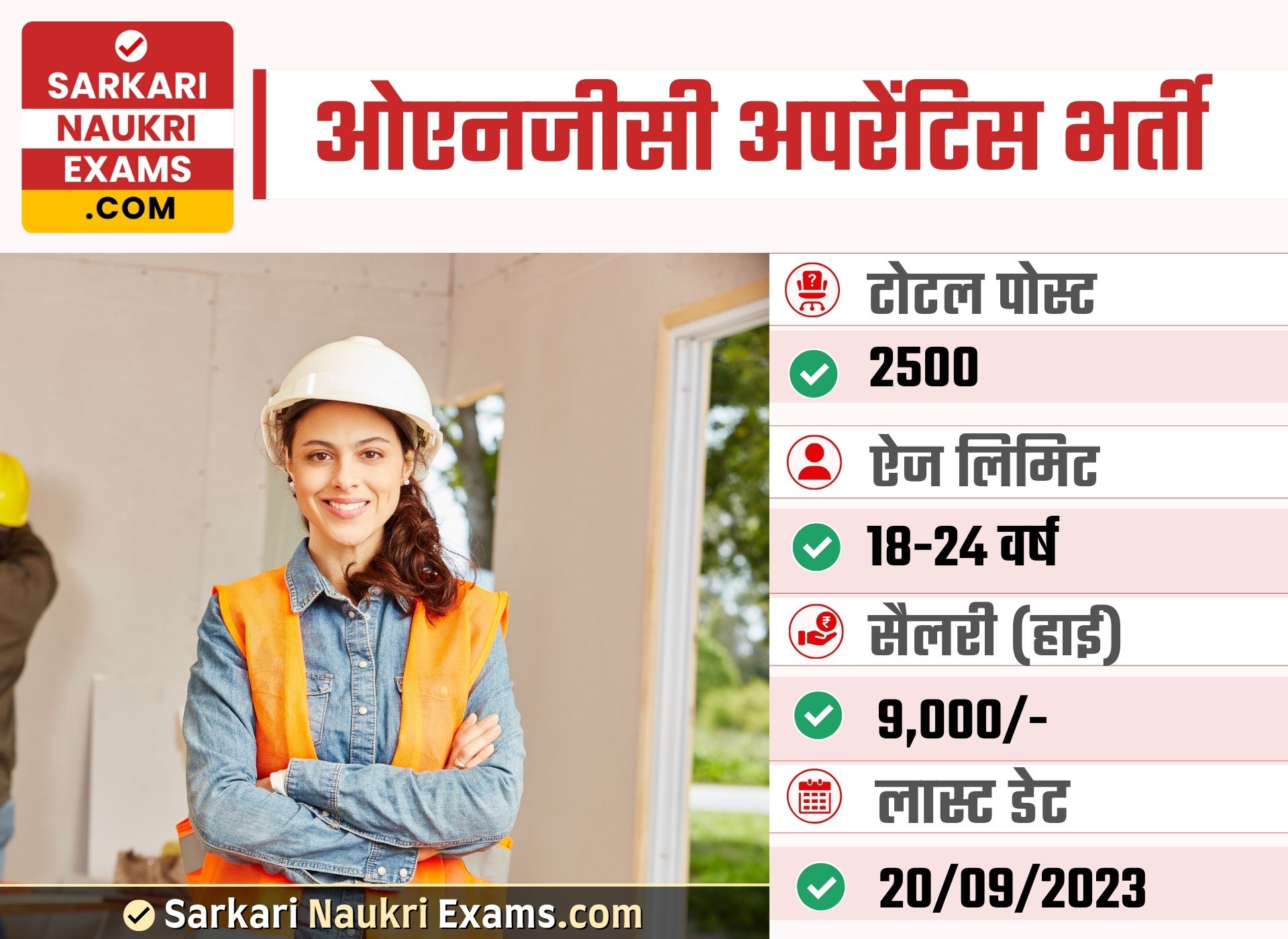 There are total 2500 vacancies for this post notification. Min Pay Scale Monthly for this post is Rs.(7,000/-). Pay Scale for this vacancy is Rs.(7,000/--9,000/-). Max Pay Scale Monthly Rs.(9,000/-). Selection for this job will be based on Merit List | Document Verification | Medical Examination. The Last Date for Application Closing is 20/Sep/2023. The result is expected to be declared on 05/Oct/2023. If you want to apply online for this vacancy(bharti), visit website - Click Here. You can download notification from Here. If you want other details such as admit card, answer key & result for 2024 year, visit official website https://ongcindia.com/. For Latest Sarkari Result, Sarkari Exam & sarkariresult Updates keep visiting www.sarkarinaukriexams.com.