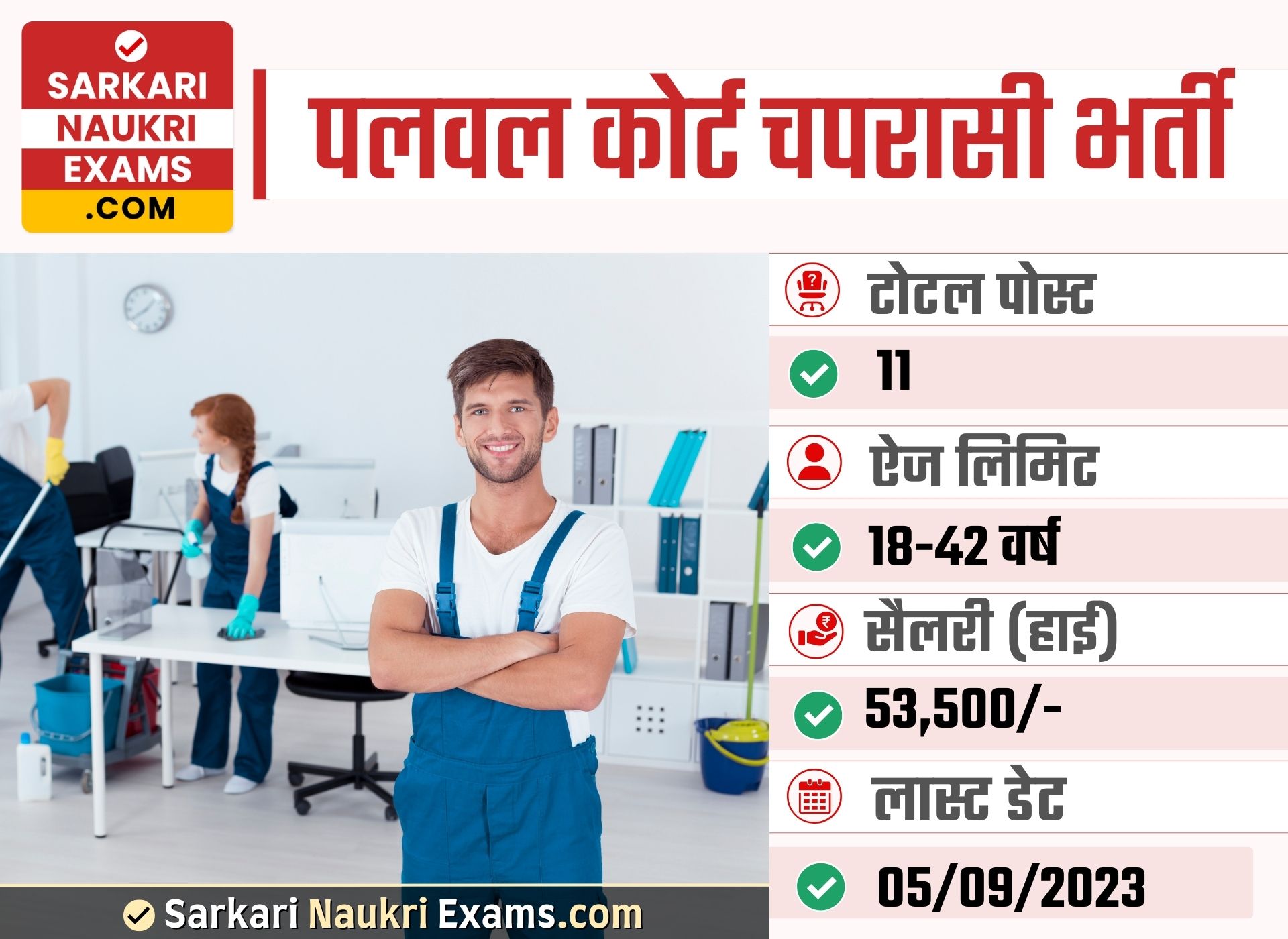 There are total 11 vacancies for this post notification. Min Pay Scale Monthly for this post is Rs.(16.900/-). Pay Scale for this vacancy is Rs.(16.900/--53,500/-). Max Pay Scale Monthly Rs.(53,500/-). Selection for this job will be based on Interview | Document Verification | Medical Examination. The Last Date for Application Closing is 05/Sep/2023. You can download notification from Here. If you want other details such as admit card, answer key & result for 2024 year, visit official website https://palwal.dcourts.gov.in/. For Latest Sarkari Result, Sarkari Exam & sarkariresult Updates keep visiting www.sarkarinaukriexams.com.