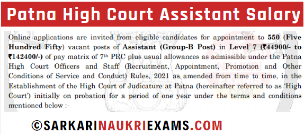 The Patna High Court Assistant is a Group B position involving administrative and legal support services. It is a grade A job at Level 07, with a scale of ₹44,900 to ₹1,42,400 per month. The job falls in the Pay Band 3 ranging from ₹9,300 to ₹34,800, with a grade pay of ₹4,600.