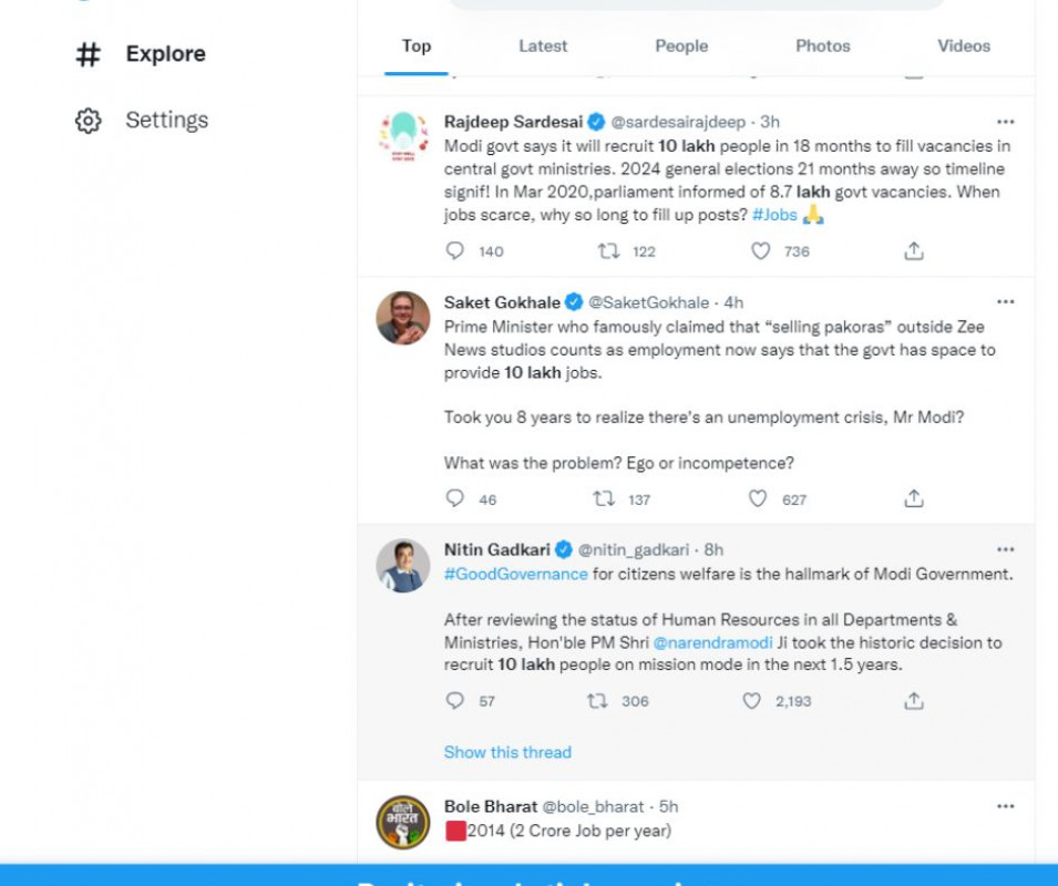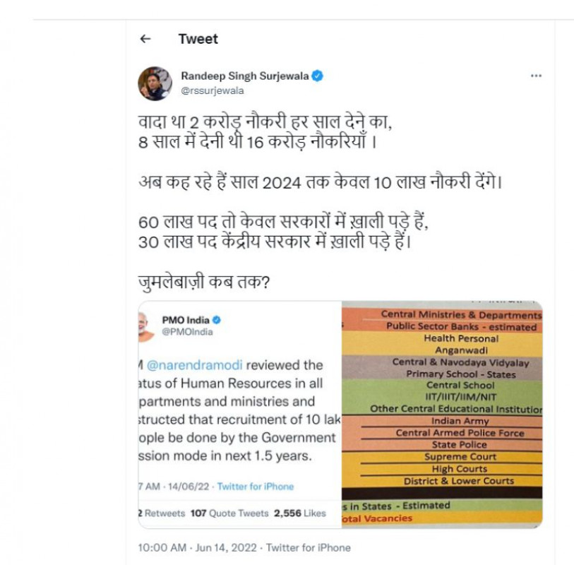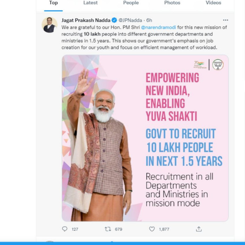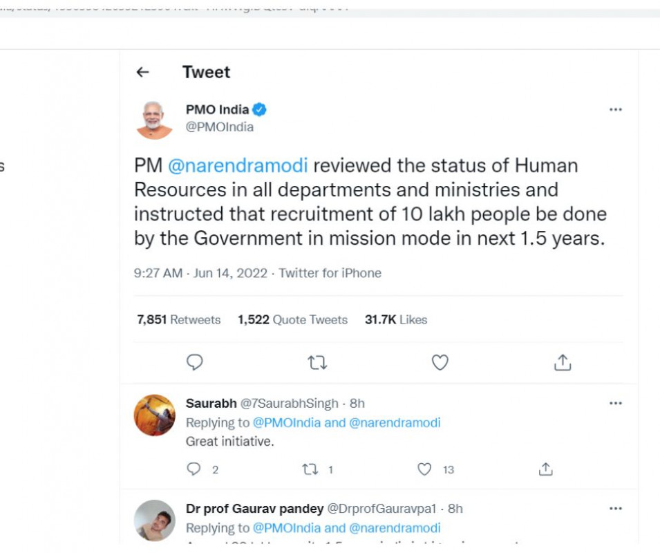 प्रधानमंत्री कार्यालय(पीएमओ) की तरफ से मंगलवार को ट्वीट कर बताया गया कि अगले 18 महीनों में 10 लाख नौकरी केंन्द्र सरकार देने जा रही है। पीएमओ के ट्विटर हैडंल से ट्वीट करते हुए यह जानकारी दी गयी कि प्रधानमंत्री नरेन्द्र मोदी ने सभी विभागों और मंत्रालयों की समीक्षा की और उसके बाद निर्देश दिया है कि मिशन मोड के अंतर्गत अगले डेढ़ वर्षों में लाख लोगों की भर्ती किया जाएगा