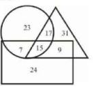 (168) The Venn diagram given below shows the number of students in a school and the games they play. The triangle represents basketball players, the rectangle represents chess players and the circle represents kabaddi players. How many students exactly two games? | नीचे दिया गया वेन आरेख एक स्कूल में छात्रों की संख्या और उनके द्वारा खेले जाने वाले खेल को दर्शाता है। त्रिकोण बास्केटबॉल खिलाड़ियों का प्रतिनिधित्व करता है, आयत शतरंज खिलाड़ियों का प्रतिनिधित्व करता है और सर्कल कबड्डी खिलाड़ियों का प्रतिनिधित्व करता है। कितने छात्र बिल्कुल दो गेम?UP( Forest Dept )-2018