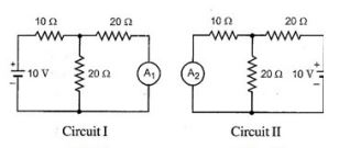 (55) Consider the two circuits I and ll shown in the given figures. Which of the following statements regarding the current flowing through the ammeters A and Az is correct? | दिए गए आंकड़ों में दिखाए गए दो सर्किट I और ll पर विचार करें। एमीटर ए और एज़ के माध्यम से बहने वाली धारा के संबंध में निम्नलिखित में से कौन सा कथन सही है? DRDO-2018