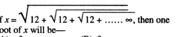 (13) Ifx=√12+ √12+√12+ .....∞, then one root of x will be-| यदि x=√12+ √12+√12+ .....∞, तो x का एक मूल होगा-JEECUP-2009