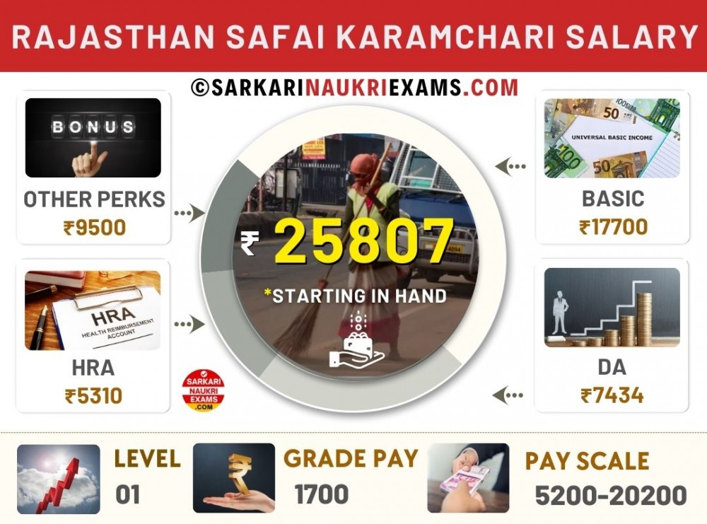 The minimum salary scale of a Rajasthan Safai Karamchari starts from ₹17,700 to ₹56,200 per month. They belong to Level 01 Grade Pay of ₹1,700. They are covered under Pay Bands PB-2 and PB-1 of ₹5,200–₹20,200.