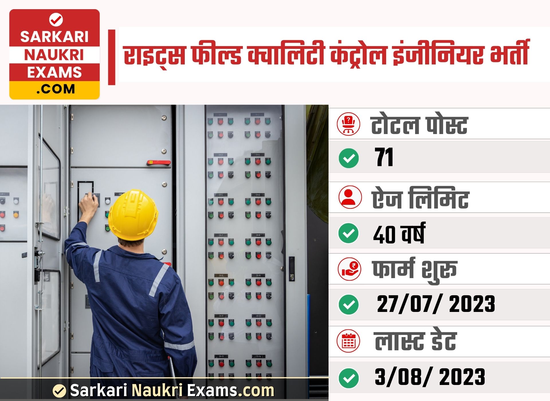 ⭐What is the recruitment opportunity offered by RITES Field Quality Control Engineer Recruitment 2023?RITES is recruiting Field Quality Control Engineers for various positions, including Supervisor cum Construction Manager, Draftsman, Quality Assurance & Control Engineer, with 71 vacancies.