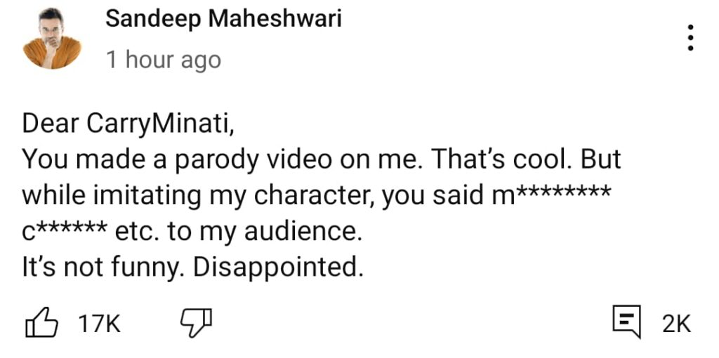 2023 (Dec): Offended by Carryminati’s video titled ‘Motivational Speaker Prodgy’.
