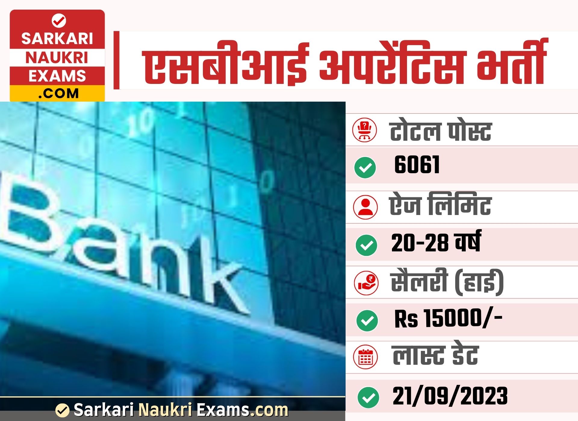 There are total 6160 vacancies for this post notification. Pay Scale for this vacancy is Rs.(As per department rule). Max Pay Scale Monthly Rs.(15,000/-). Selection for this job will be based on Online Written Exam | Local Language Test | DV | Medical Examination. The Last Date for Application Closing is 21/Sep/2023. Fee for General Candidate is Rs.300/-, OBC - Rs.300/- , SC - Rs.0/- & ST - Rs.0/-. You can download notification from Here. If you want other details such as admit card, answer key & result for 2024 year, visit official website https://sbi.co.in/web/careers/current-openings. For Latest Sarkari Result, Sarkari Exam & sarkariresult Updates keep visiting www.sarkarinaukriexams.com.