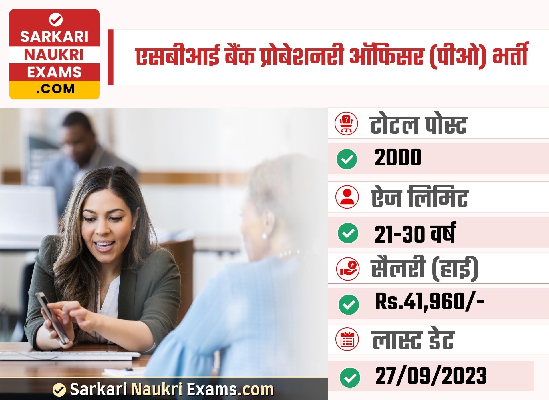 ![]() | SBI Bank Probationary Officer Recruitment 2023 | 2000 Vacancies Online Application - The State Bank of India (SBI) is currently accepting online applications for the position of Probationary Officer, with a total of 2000 vacancies available. To ensure you don't miss out, it's important to note key details such as the application deadline, examination date, and admit card release date for the SBI Bank Probationary Officer Recruitment for the 2023-2024 period. The application process commenced on September 7, 2023. The last date to submit your application is September 27, 2023. Successful candidates can anticipate a monthly pay scale (salary) ranging from ₹36,000 to ₹41,960. The age limit for this position is 21 to 30 years. Please carefully review the instructions for applying online for the Probationary Officer position, including eligibility criteria, application fees, salary details, and more. If you have any questions or require additional information regarding this opportunity, please don't hesitate to ask in the comments section. SBI Bank Probationary Officer (PO) Recruitment 2023एसबीआई बैंक प्रोबेशनरी ऑफिसर भर्ती 2023 | 2000 रिक्तियों के लिए ऑनलाइन आवेदन - भारतीय स्टेट बैंक (एसबीआई) वर्तमान में प्रोबेशनरी ऑफिसर के पद के लिए ऑनलाइन आवेदन स्वीकार कर रहा है, जिसमें कुल 2000 रिक्तियां उपलब्ध हैं। यह सुनिश्चित करने के लिए कि आप चूक न जाएं, 2023-2024 अवधि के लिए एसबीआई बैंक प्रोबेशनरी ऑफिसर भर्ती के लिए आवेदन की अंतिम तिथि, परीक्षा तिथि और प्रवेश पत्र जारी करने की तारीख जैसे मुख्य विवरणों पर ध्यान देना महत्वपूर्ण है। आवेदन प्रक्रिया 7 सितंबर, 2023 को शुरू हुई। अपना आवेदन जमा करने की अंतिम तिथि 27 सितंबर, 2023 है। सफल उम्मीदवार ₹36,000 से ₹41,960 तक मासिक वेतनमान (वेतन) की उम्मीद कर सकते हैं। इस पद के लिए आयु सीमा 21 से 30 वर्ष है.| कृपया प्रोबेशनरी ऑफिसर पद के लिए पात्रता मानदंड, आवेदन शुल्क, वेतन विवरण और बहुत कुछ सहित ऑनलाइन आवेदन करने के निर्देशों की सावधानीपूर्वक समीक्षा करें। यदि इस अवसर के संबंध में आपके कोई प्रश्न हैं या अतिरिक्त जानकारी की आवश्यकता है, तो कृपया टिप्पणी अनुभाग में पूछने में संकोच न करें। This opening is only for All India. |