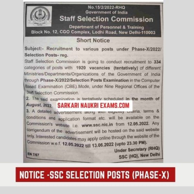 SSC Selection Phase X Admit Card 2022 | Exam Date