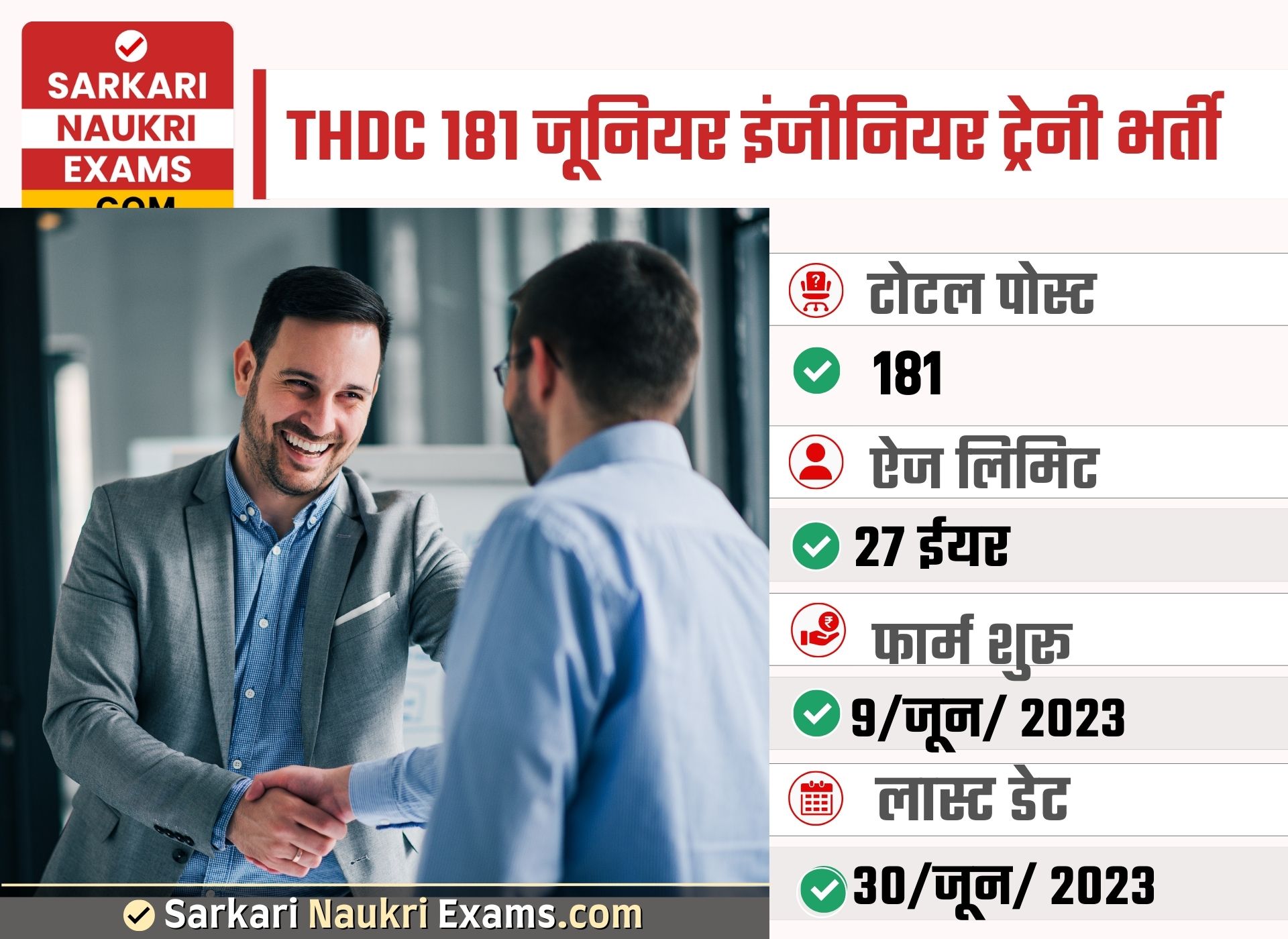 There are total 181 vacancies for this post notification. Pay Scale for this vacancy is Rs.(As per department rule). Selection for this job will be based on Computer Based Test | Interview / Viva | DV, Medical Exam. The Last Date for Application Closing is 30/Jun/2023. Fee for General Candidate is Rs.600, OBC - Rs.600 If you want to apply online for this vacancy(bharti), visit website - Click Here. You can download notification from Here. If you want other details such as admit card, answer key & result for 2024 year, visit official website https://www.thdc.co.in/. For Latest Sarkari Result, Sarkari Exam & sarkariresult Updates keep visiting www.sarkarinaukriexams.com.