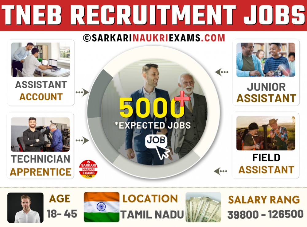 Tamil Nadu Electricity Board (TNEB) has released more than 5000 job vacancies for the posts of Technician Apprentice, Junior Assistant, and Assistant Accounts Officer. These vacancies are released in various districts of Ariyalur, Chennai, Coimbatore, and Cuddalore. Candidates who are between 18 and 45 years of age can apply online or offline. The pay scale is from Rs. 39,800 to Rs. 1,26,500 per month based on the exam results or direct selection for some posts. Application fees vary according to the rules. The positions are permanent, with scope for growth in salaries and promotion.