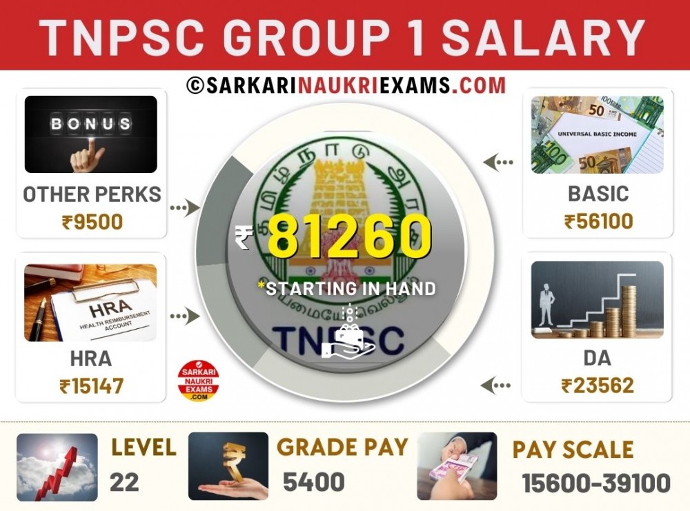 The Starting TNPSC Group 1 Salary in hand is ₹81260, inclusive of all allowances and deductions. Considering the current perks and deductions based on the 7th CPC, the highest group 1 basic pay salary, after 40 years of continuous service, can reach up to ₹254620. The overall monthly in-hand amount for all these posts of the Group 1 Pay Scale in Tamilnadu will be almost identical with few variations in perks and deductions.