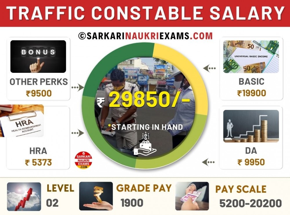 A traffic constable is a member of the traffic police. Their job is to control city traffic, prevent road accidents, and enforce traffic rules. The starting basic pay for a Traffic Constable is between ₹19,900 and ₹63,200 per month. The grade pay for a Traffic Constable is ₹1900 which falls under Level 02. The salary for a traffic constable falls under Pay Band 3, i.e., PB-1 (₹5,200 to ₹20,200).