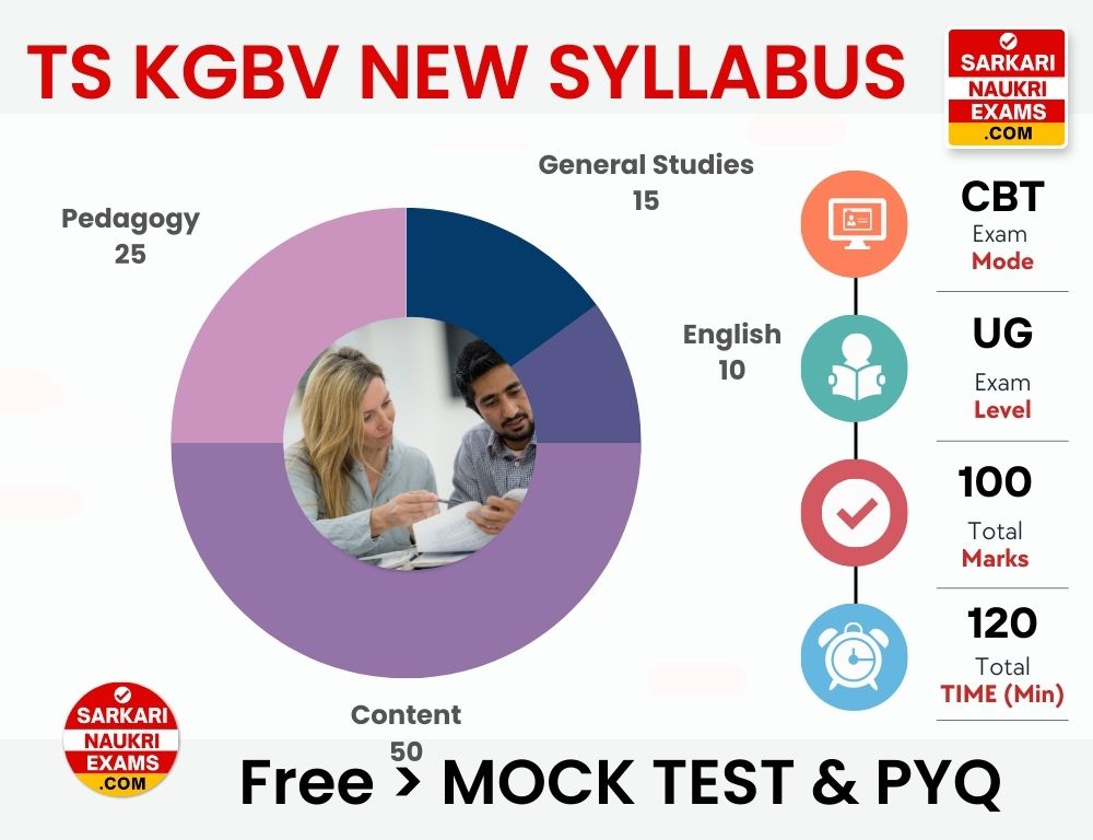 The TS KGBV Syllabus 2023 for Special Officers (SOs) in KGBVs/URSs, conducted by the Telangana School Education Department, consists of an online exam in objective (MCQ) format. It is a graduate-level exam with a total of 100 questions carrying 100 marks. The exam duration is 120 minutes, and it is available in Hindi and English languages (excluding the language subject). TS KGBV Syllabus 2023 covers various topics including General Knowledge & Current Affairs, Perspectives in Education, Pedagogy Across Curriculum, Child Development, School Management, and Administration.