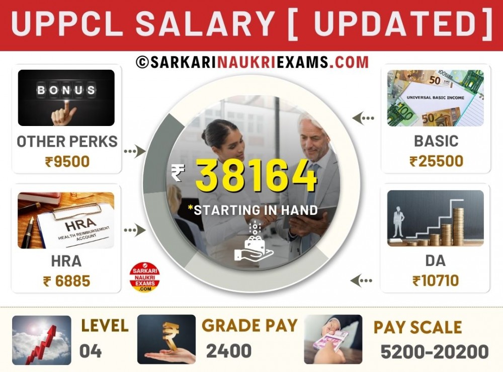 The in-hand salary is ₹38,164 per month, with allowances and deductions. The maximum in-hand salary can reach up to ₹1,17,560 after 40 years of service. The salary structure for other similar positions, such as UPPCL AE, is almost the same with slight variations in perks and deductions. For detailed information on salary, Grade Pay, and promotions, please refer to the full details below.